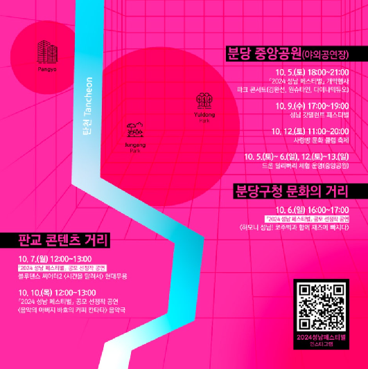 2024 성남 페스티벌은 성남시 전역(성남 탄천(탄천종합운동장 앞), 성남아트센터, 판교콘텐츠거리, 성남시청, 희망대근린공원 등에서 열리며, 일부 프로그램은 사전 예약이 필요합니다.